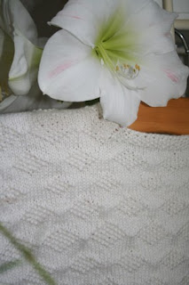 – One almost finished white natroje in said DK Zephyr. More on the progress of this sweater very soon. Below is a detail of the brocade diamond pattern being admired by a very sensitive Amaryllis. Enjoy Carol