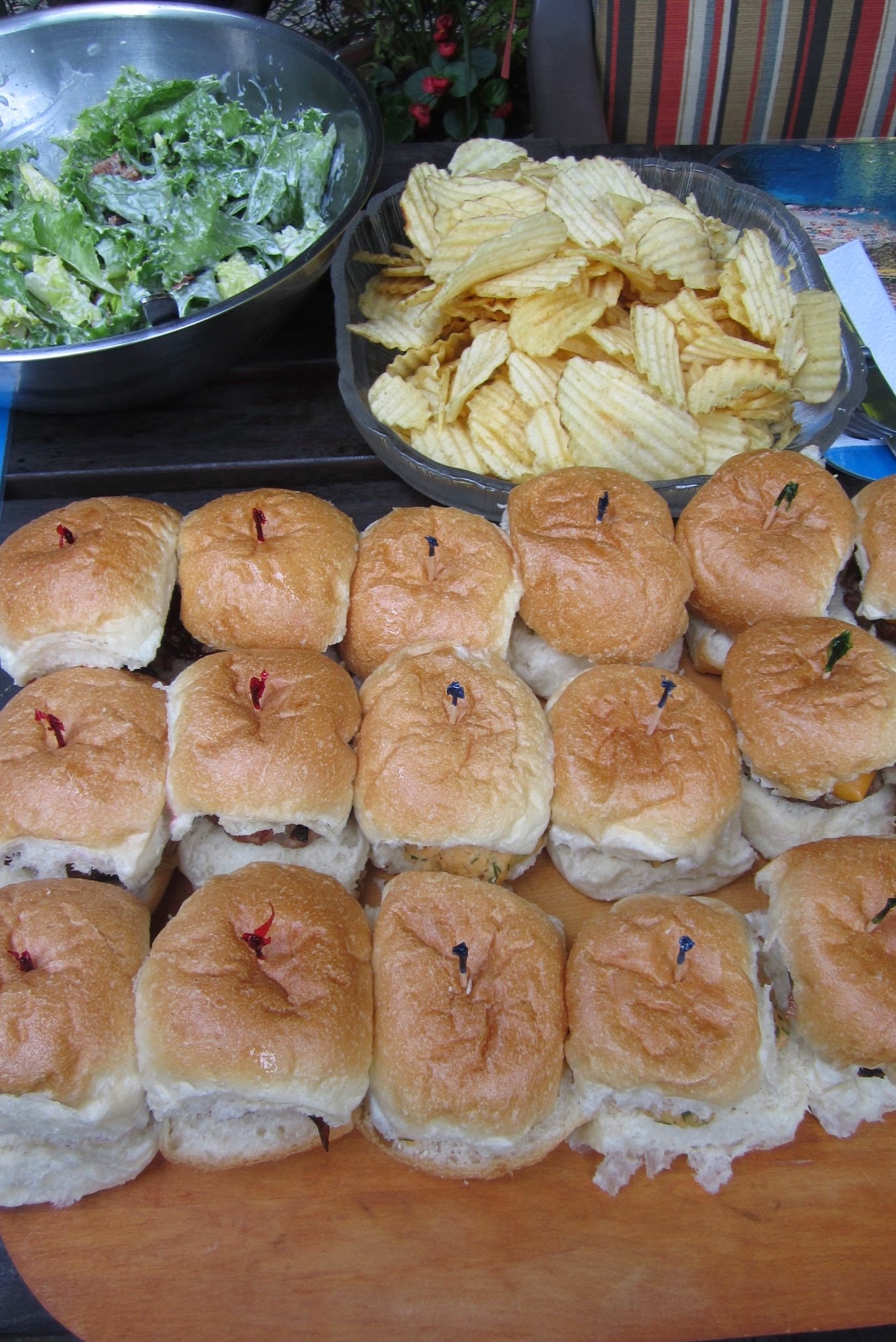 8. My husband appeared with a bag of potato chips to round out the meal and we all finally sat down to sliders of – salmon with mayo dill and capers, turkey with cranberry sauce and caramelized onions and last, but not least, a traditional beef slider with tomato, melted cheese and ketchup!! YUM