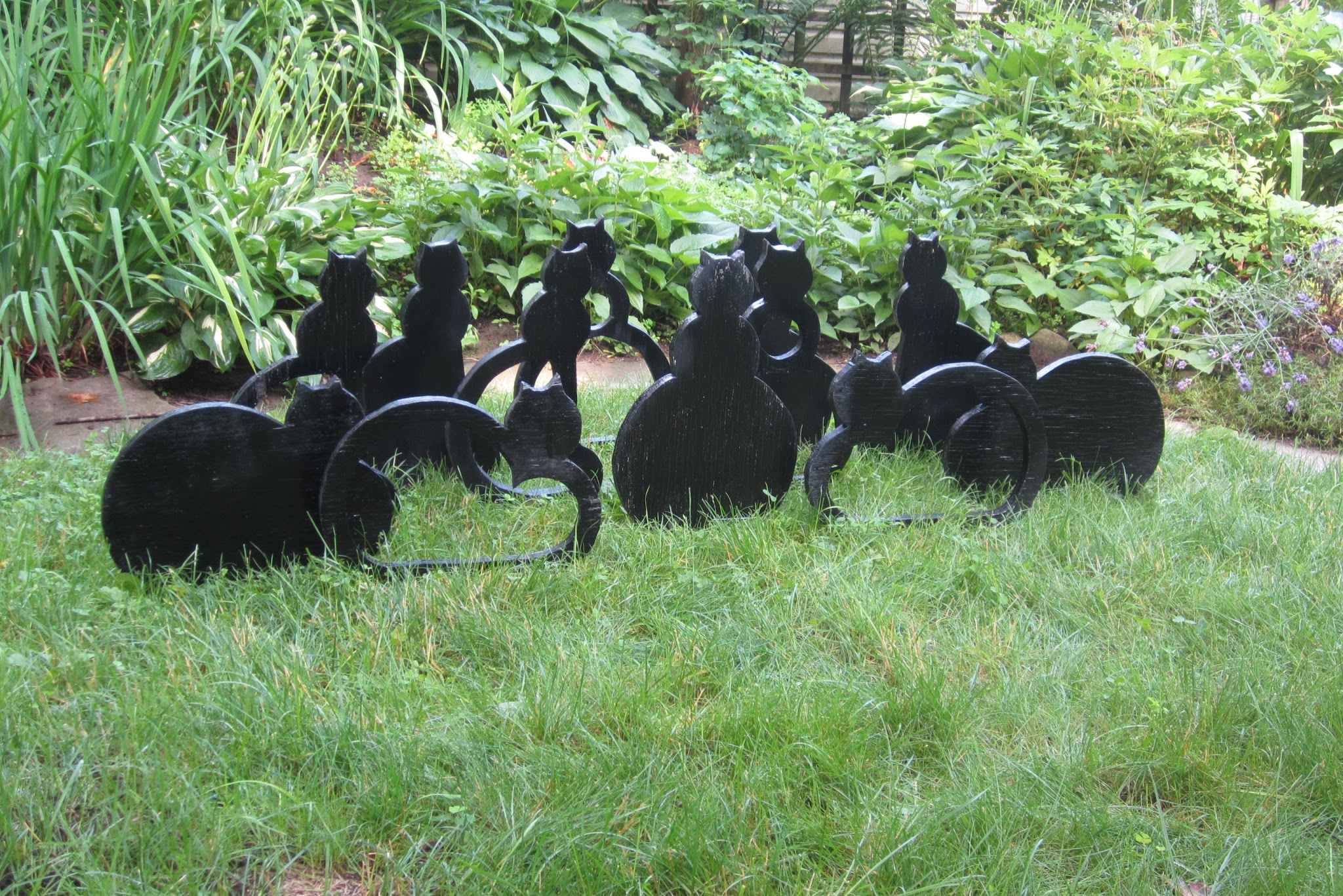 I tried to order wood stain at another store. I found the stain, but it had to be tinted. However, there was no way of adding the colour of tint to the stain, on-line. I did not curtsy. Plus I had several other items to order including “fairy lights” (it’s an English thing) for the apple tree. Maybe no midsummer dancing and curtsying this year in the garden. I also needed to buy spray paint for my garden ornaments – twelve wooden cats – they needed to be “refreshed.” Again maybe not this year. Anyway, I’ve never seen a cat curtsy, a dog, yes, but a cat, never.