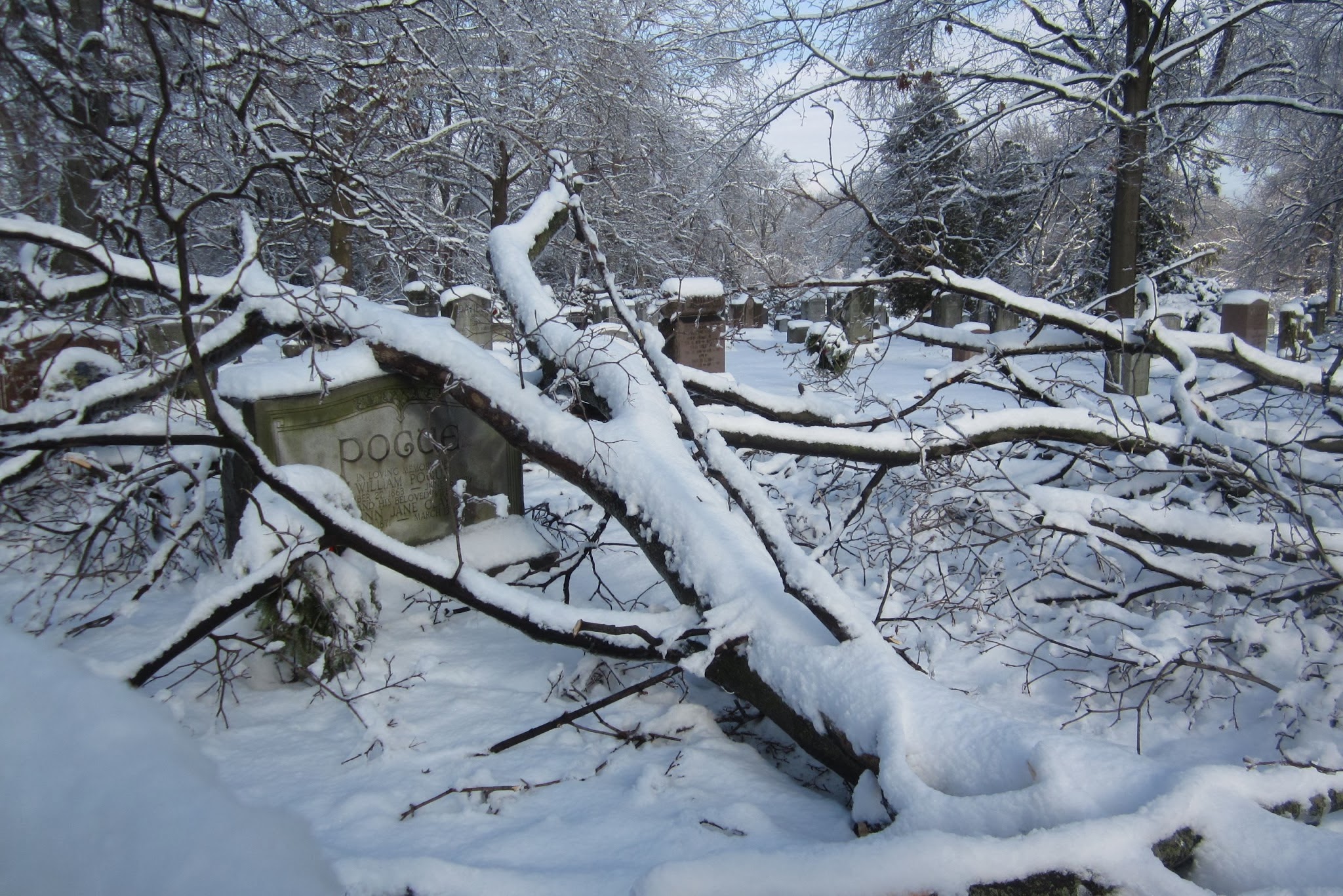 OK, we got the message. We turned back, but before I left, I took some pictures. Many headstones were buried under layers of fallen trees. I looked for those little ironies in life. Perhaps a last name of “Snow” covered in it, or “Frost” iced with it, or “Thatcher” laced with it. I’m sure I could have found a few, if we had been able to walk the half mile or so through the cemetery to Bayview Ave.