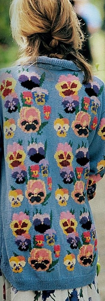 I tried to find contact information for Susan; but couldn’t, so I am posting this picture of her Pansy sweater without permission; but maybe this will sell a book or two for her or encourage her to start publishing again.