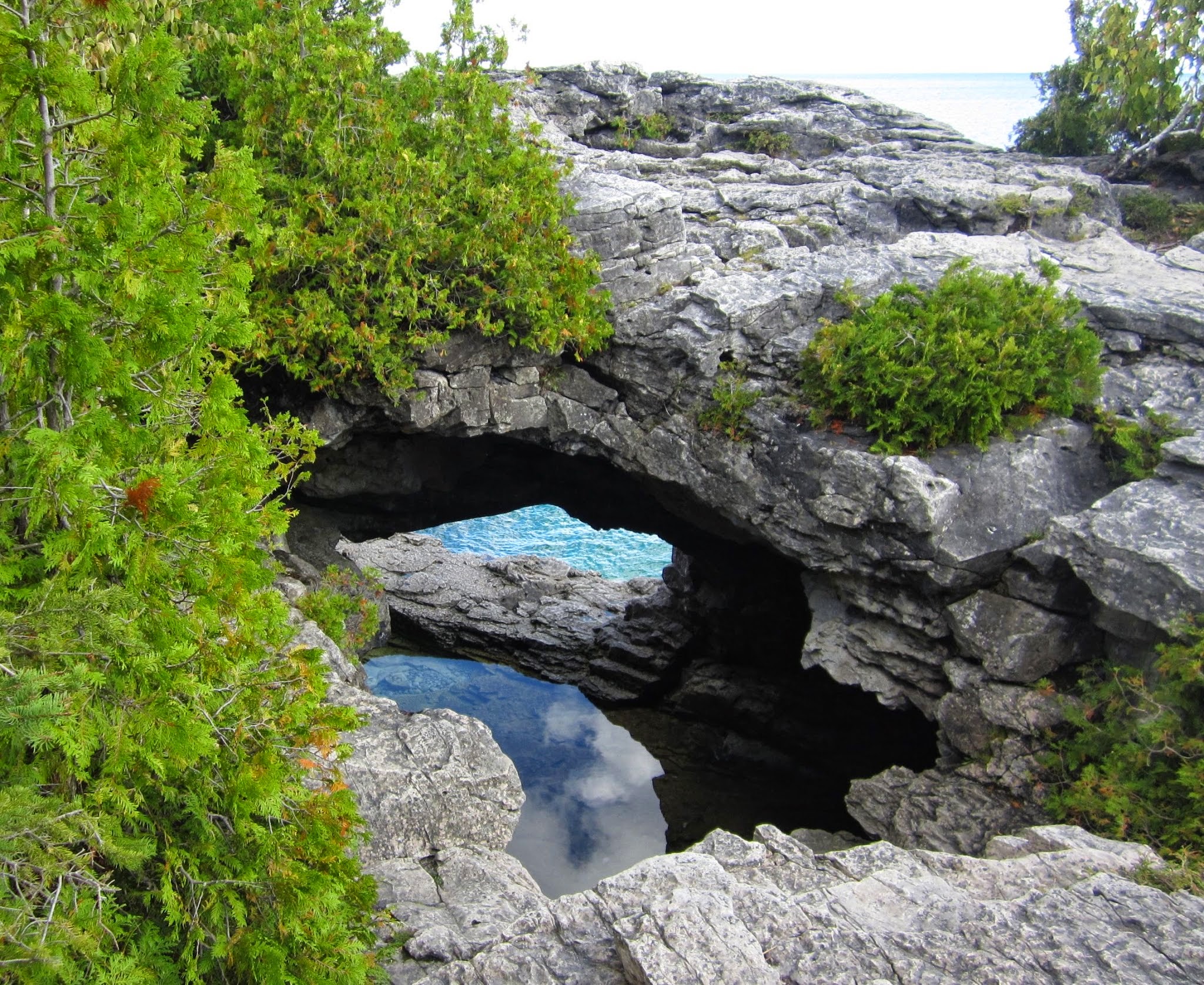 Finally a day of almost complete sun. After breakfast at Craigies in Tobermory, we drove to the Fathom V National park, paid our entrance fee – less than $15.00 – sorry I can’t remember it exactly – sun fever no doubt 🙂 and began our walk. Here you have a choice of trails to take to the very popular grotto area. The easiest and most direct route is a wide crushed stone path good for strollers, wheelchairs and Sunday walkers. The “road less travelled” is a more traditional Bruce Trail trek – narrow, winding, and just so pretty. Part of this trail also crosses a very stony beach with gorgeous views of the sapphire waters of Georgian Bay.