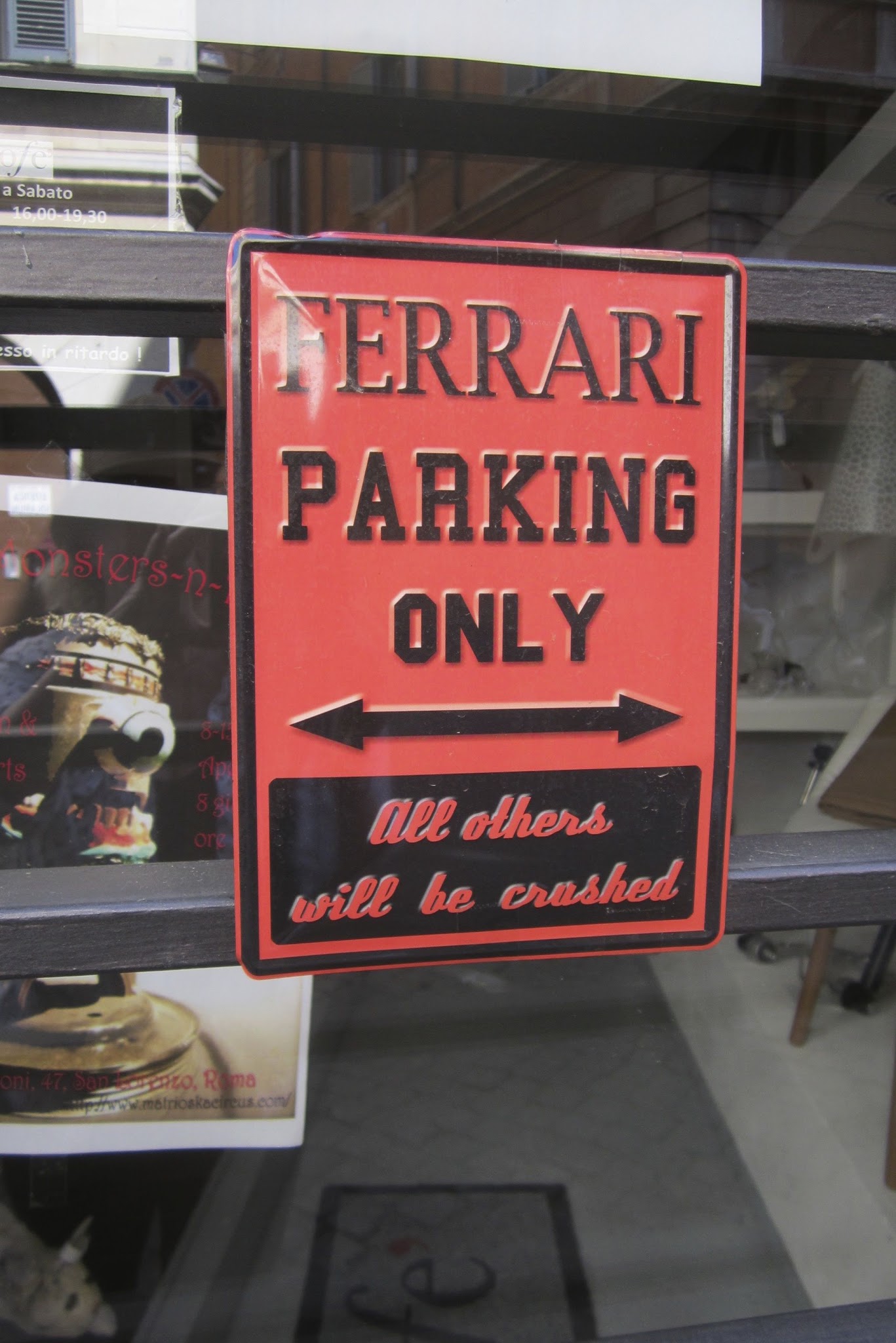 I took the picture in Rome. It was in the window of a shop, that obviously didn’t want just anyone parking there. The fine print reads “All others will be crushed.” Interesting that the sign’s in English and it was spotted in Rome. Another mystery!!