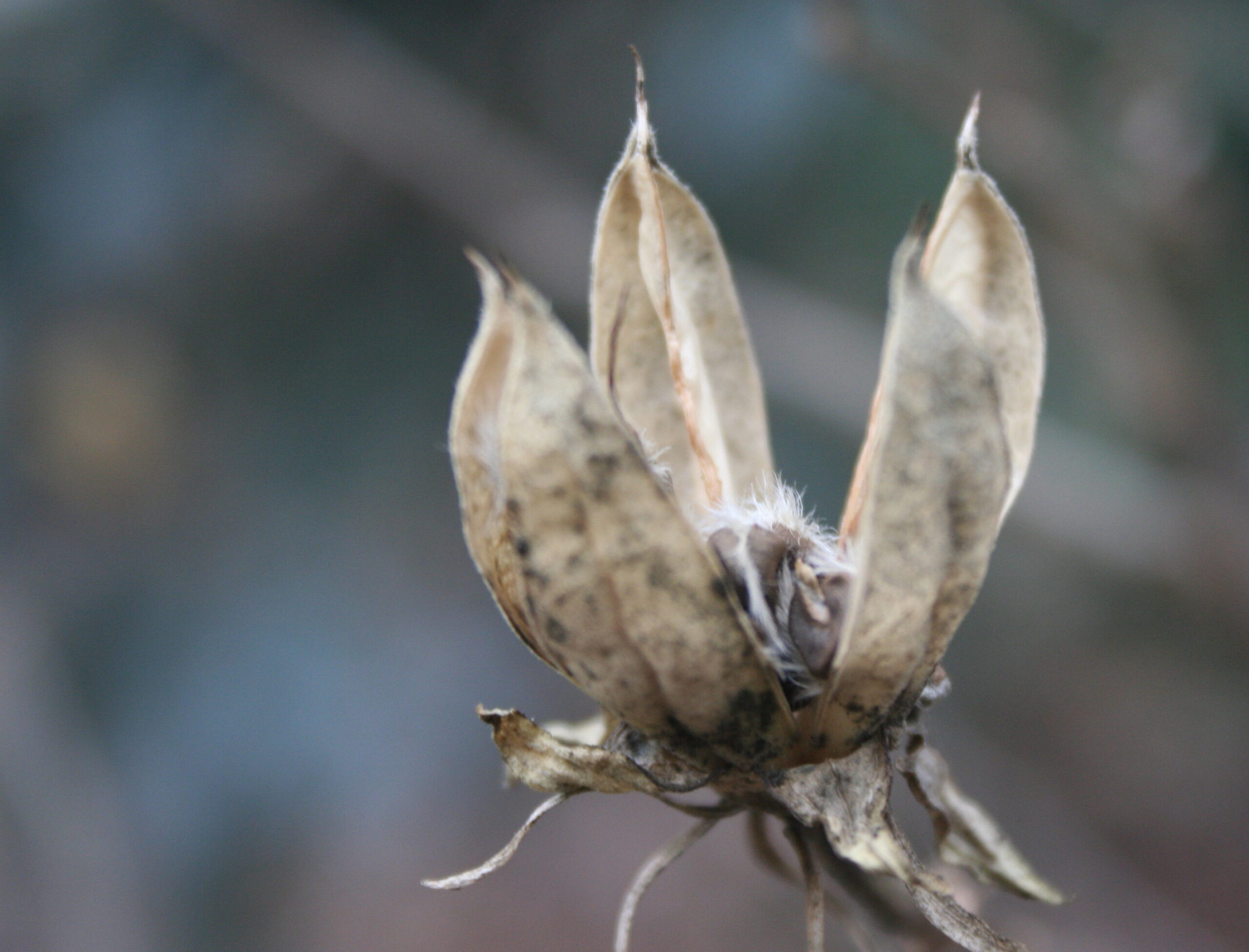 A pod from my Rose of Sharon tree. I like to think of them as “podcasts” – bursting open and throwing their seeds to the wind. These are my winter flowers.