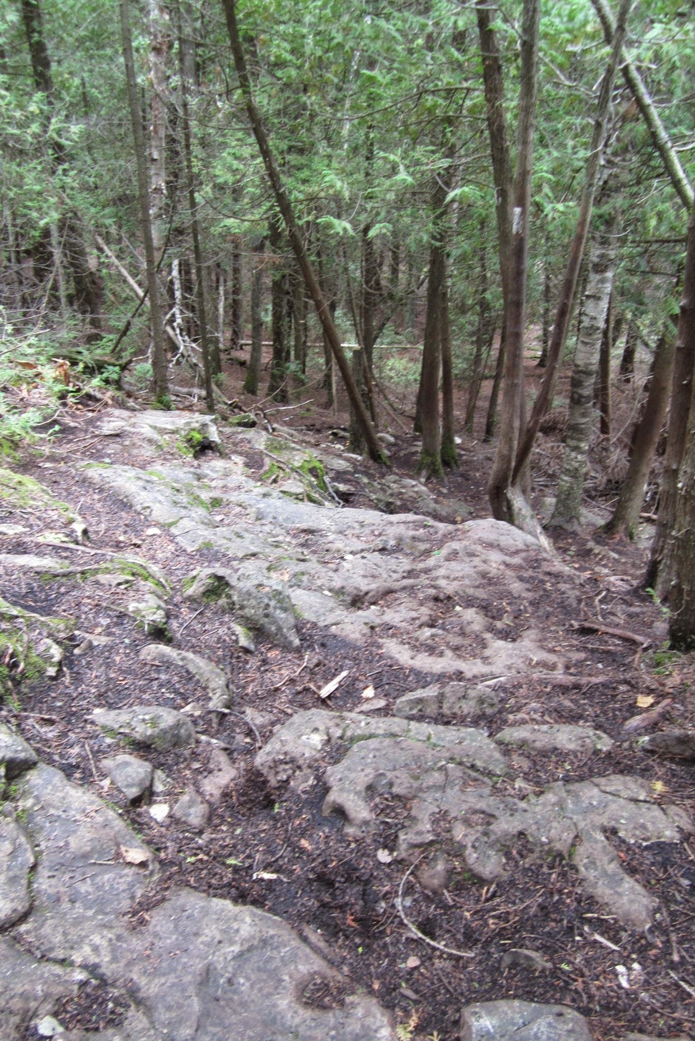 With an air of complete confidence, we strolled up to the billboard at the entrance to the trail. This is where trail conditions are posted and a lot the other information, such as, notes about snakes and bears, just in case. Then we read the fine print. Paraphrased, it went something like this – “Please note that this trail is one of the most difficult on the entire Bruce Trail system. Know your skill level.” Gulp! I was ready to turn back. I had visions of a path skirting rock faces, with no obvious means of hanging on!! This was not going to be fun!! My husband was not deterred. “When it gets too difficult, we’ll turn back,” he said. Whew! now if there were an accident, it wouldn’t be my fault. He was given an opportunity to back out and he didn’t – “Oh no moment” responsibility dodged again!!