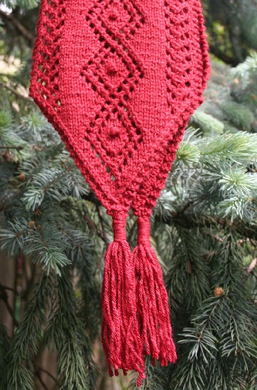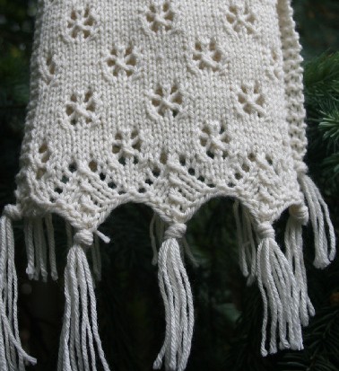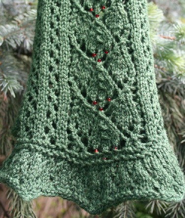 A few years ago I designed Winter Lace Scarves. I decided that if I had to live for 3 or 4 months of the year in the cold and dark, I might as well try to enjoy it. Sprig scarf is my translation of a sprig of holly, with berries, into knitted, beaded lace. I added to the collection “Sparkle” because I wanted to capture the lights and festivities of the Christmas Season also in lace. I used a diamond motif for the glitz and a tassel for the ornament. Finally I couldn’t have a winter collection without snow. So I added Flake! Flake can also be beaded at each double decrease for more sparkle.