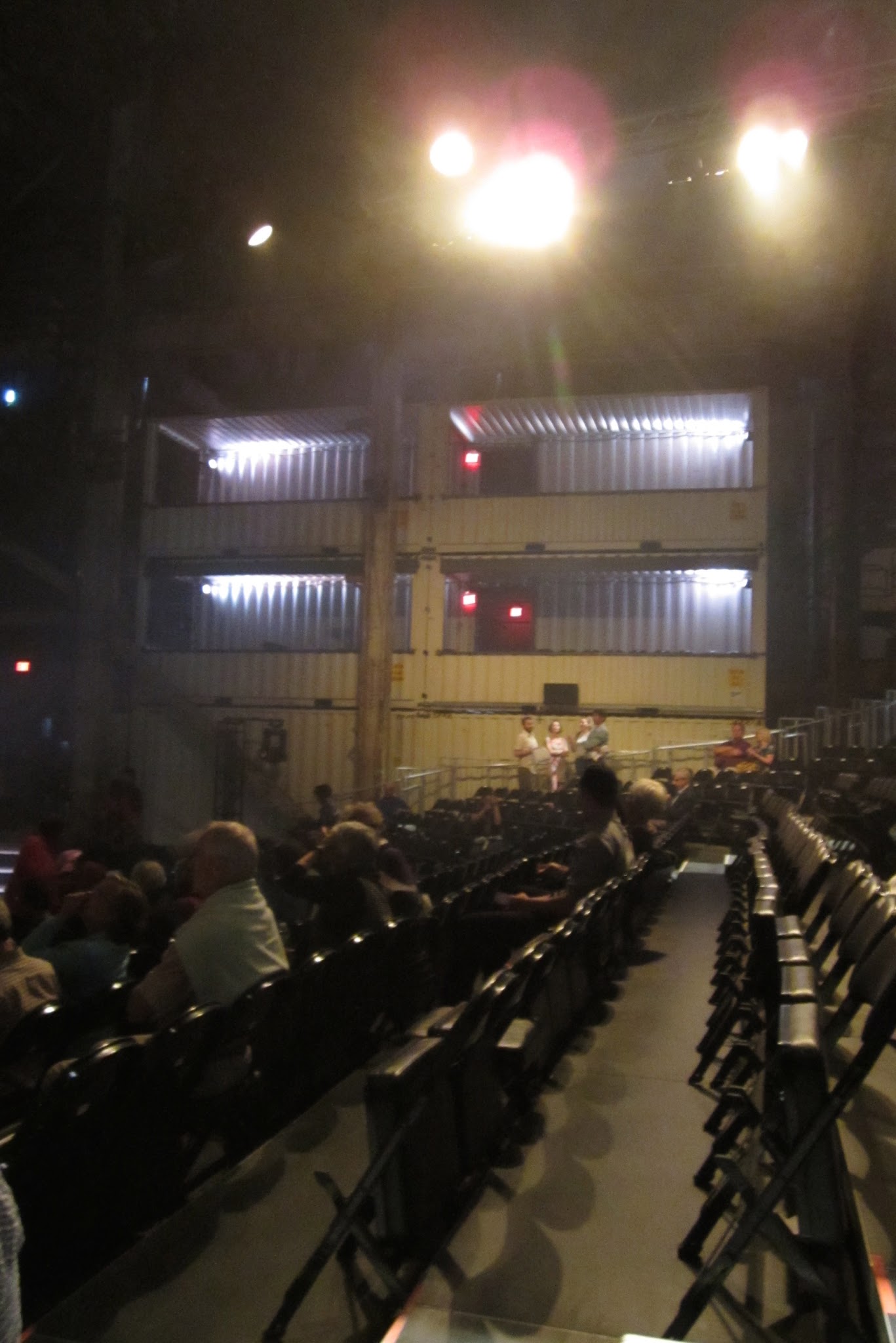 We saw James I last Tuesday evening. It was stunning!! The play fitted perfectly into a theatre, which featured on-stage seating, balconies and galleries made from old shipping containers, a five story ceiling, with supporting walls of poured concrete, and a haunting darkness in the absence of overhead lighting. I was transported.