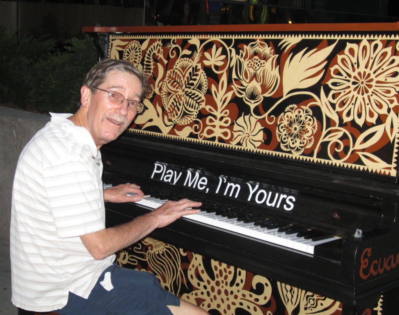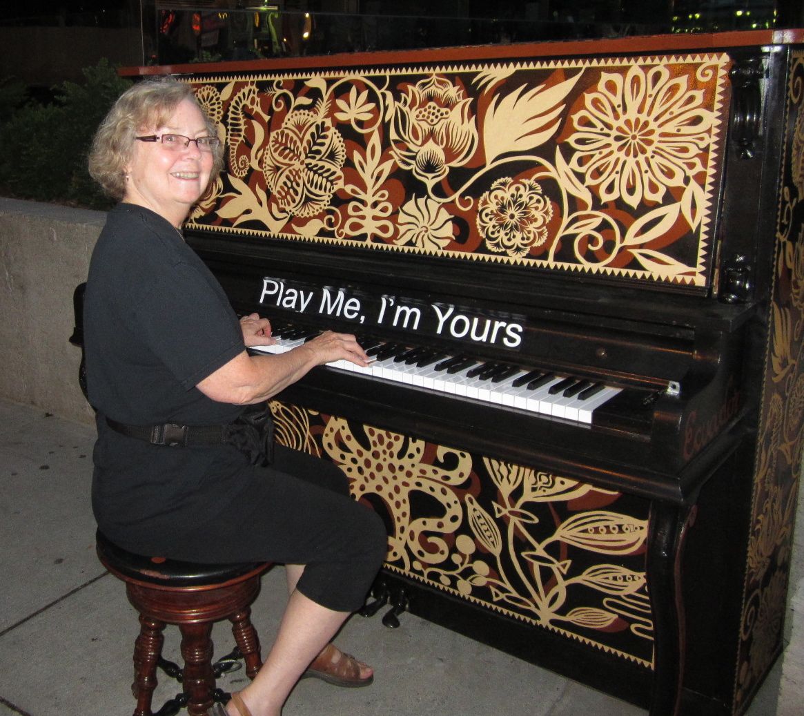 On Monday, another talented person, Fiona Ellis – knitter extraordinaire, sent me a note to say that there was a street piano at the Roy Thompson Hall. I couldn’t resist!!! My husband kindly agreed to drive me downtown to see what was “happening” in Ecuador. That’s the country represented by this piano. No one was around to play, so my husband and I “faked” it.