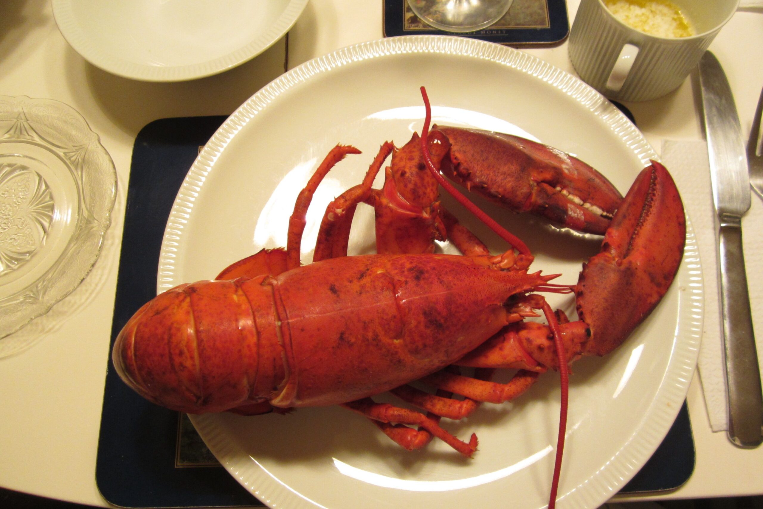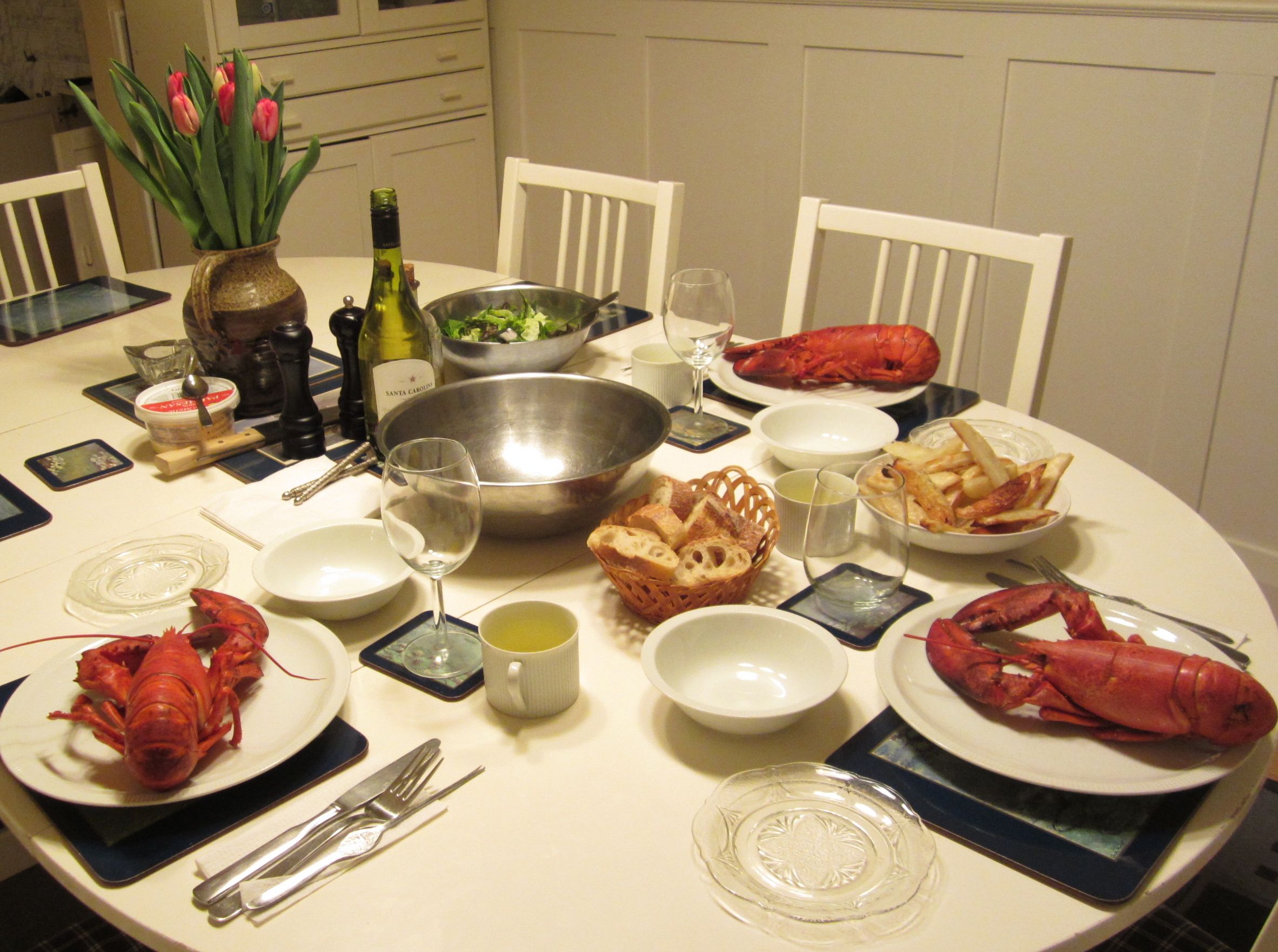 The supermarket just down the road always has a good supply of live lobster and they will steam them for you, if you can wait 15 minutes or so. I have never cooked a live lobster – I know, I’m a wimp!! I got to the supermarket about 5:00pm and since no one ahead of me had ordered lobster, I just had to wait for my 3 to be cooked and I was home by 5:30. I wrapped the box in a blanket to keep the lobsters warm and set about making french fries from scratch – we do them on a cookie sheet in the oven – a little less fat. I then made the salad while my husband set the table. I don’t have a lot of fancy dishes so the drawn butter is in small coffee cups – oh well. To me it’s more about what’s on the plates than the plates!!