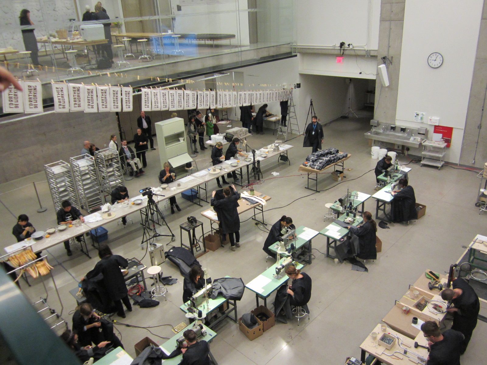 Here is the main installation. Although it resembles a “sweat shop” in the garment industry, it is really meant to be a celebration of work. Every once in a while the “artists” would break into song. An interesting take on the daily grind.
