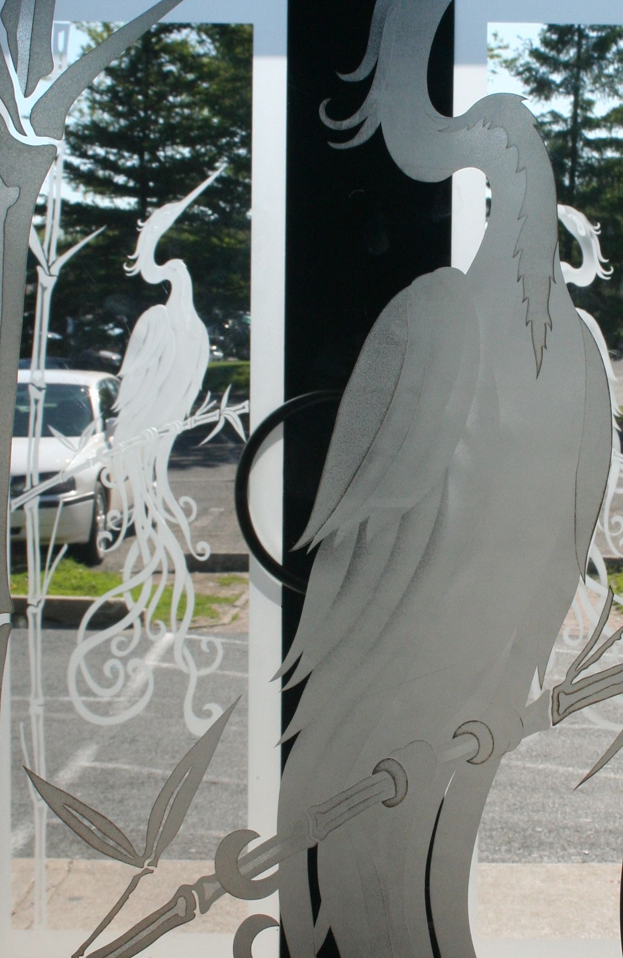 I think that both the gate and the rhododendron are intricate as is the stitch. Here is another entranceway with plumage. Its from a restaurant in Fredericton. Unfortunately the parking lot in the back ground reminds us that we are “here” in this time zone and not “there” in Victorian England. This is one of the reasons I love gardens and lace. They are both escapes.