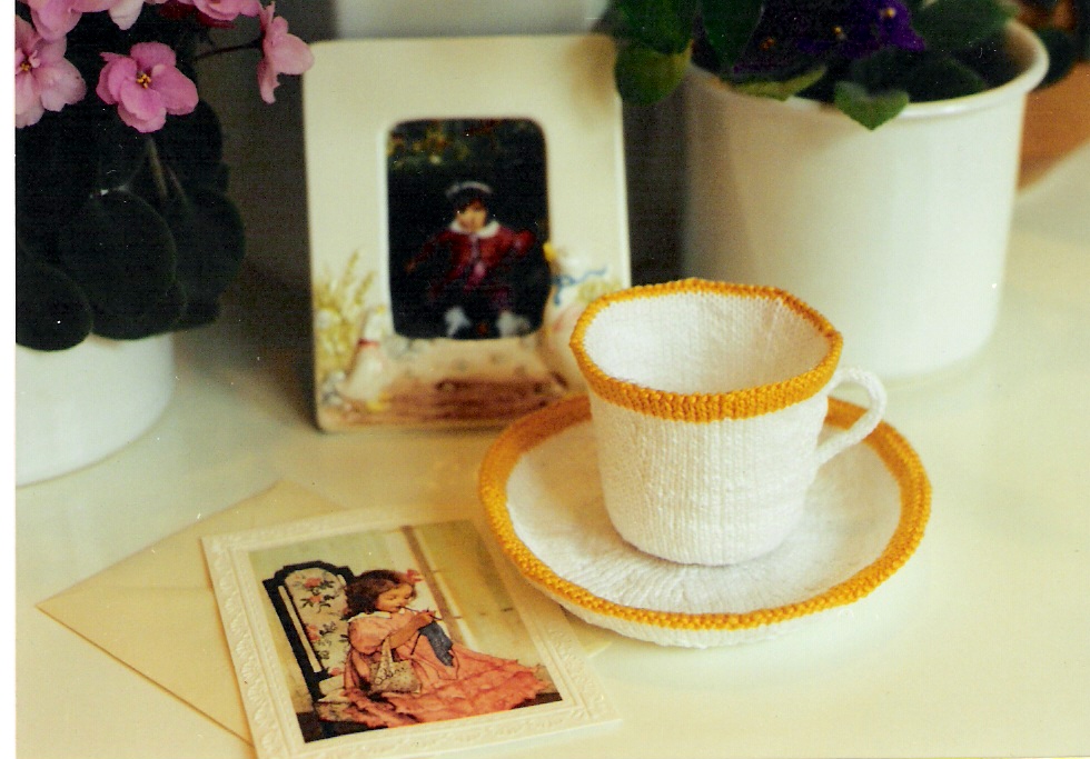 Well, over the years, a number of people have knit them. They were knit as gifts for teacup collectors, for Mother’s day, for mothers to give to daughters and the occasional son as keepsakes. Some knit them for the challenge of knitting something new and different. Others knit them because they were there. I knit them for the fun of trying to translate a treasured teacup pattern into knitting.