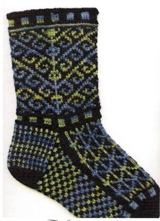 I blew it – no more e-mails, and just voice mail, when I called…It was just too early in the morning to think seriously about anything! So I went back to Robyn’s sock patterns. I noticed that there were 5 or 6 socks with references to dance or music in their titles. I also saw lovely dancing piris in many of the fair isles. Some socks had stately quadrilles of cables and ribs, while others had quiet pas de deux passages of knit and purl. There were arabesque patterns in lace and spritely slip stitch motifs. Not to mention the lovely diagonal sashays and the sensuous curving tangos. All phrased within the sonata of the sock!