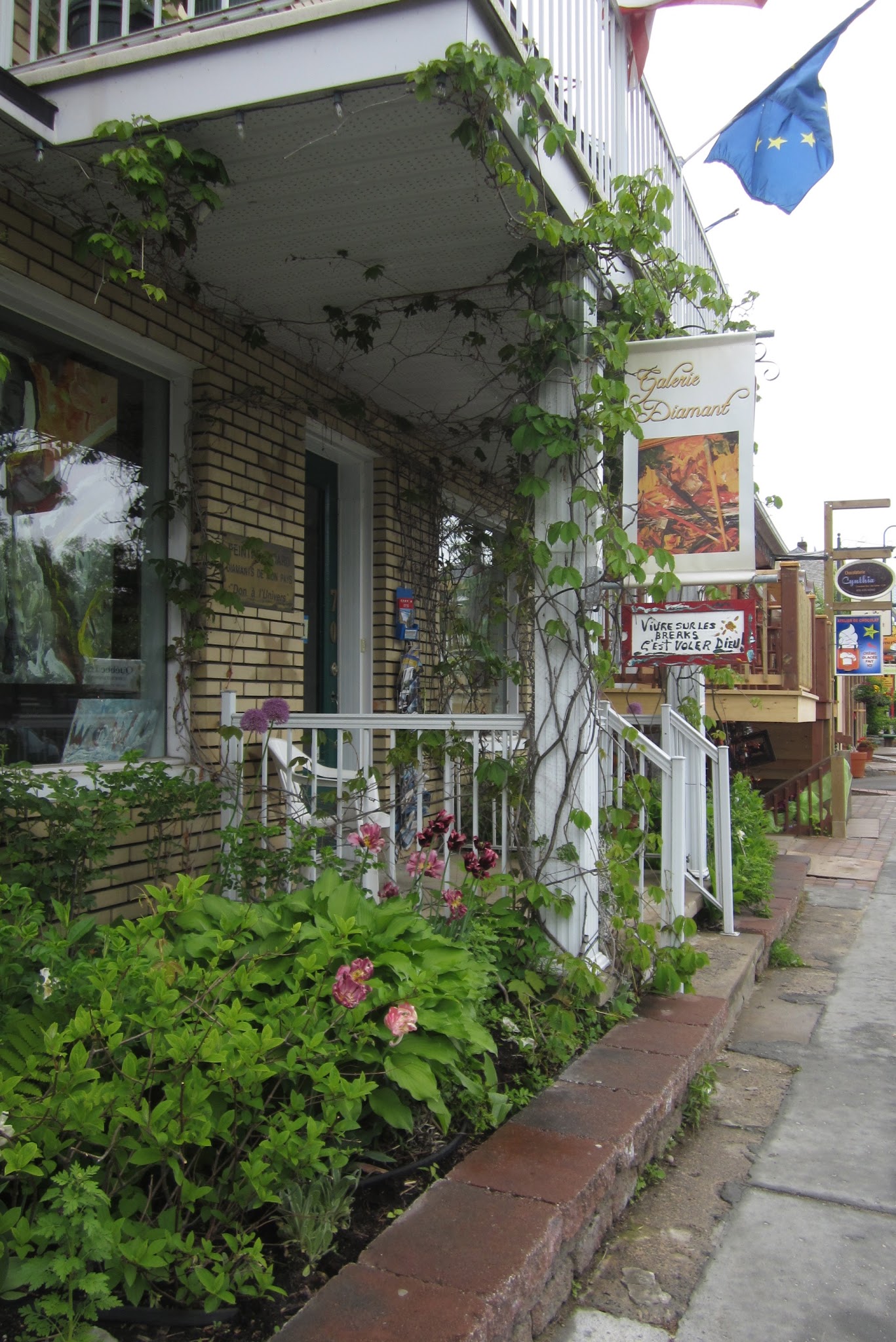 The weather – you had to ask, didn’t you. Well, the next day, the rain had turned to fog, which cancelled the view from our unit. Why we pay a premium for a spectacular view, when nature, at a whim, can wipe it out with a mist so thick we didn’t think we could drive, let alone bike. We were, however, able to creep along the coast to Baie St Paul for a coffee in a pretty cafe, while the fog cleared and the rain started again 🙂