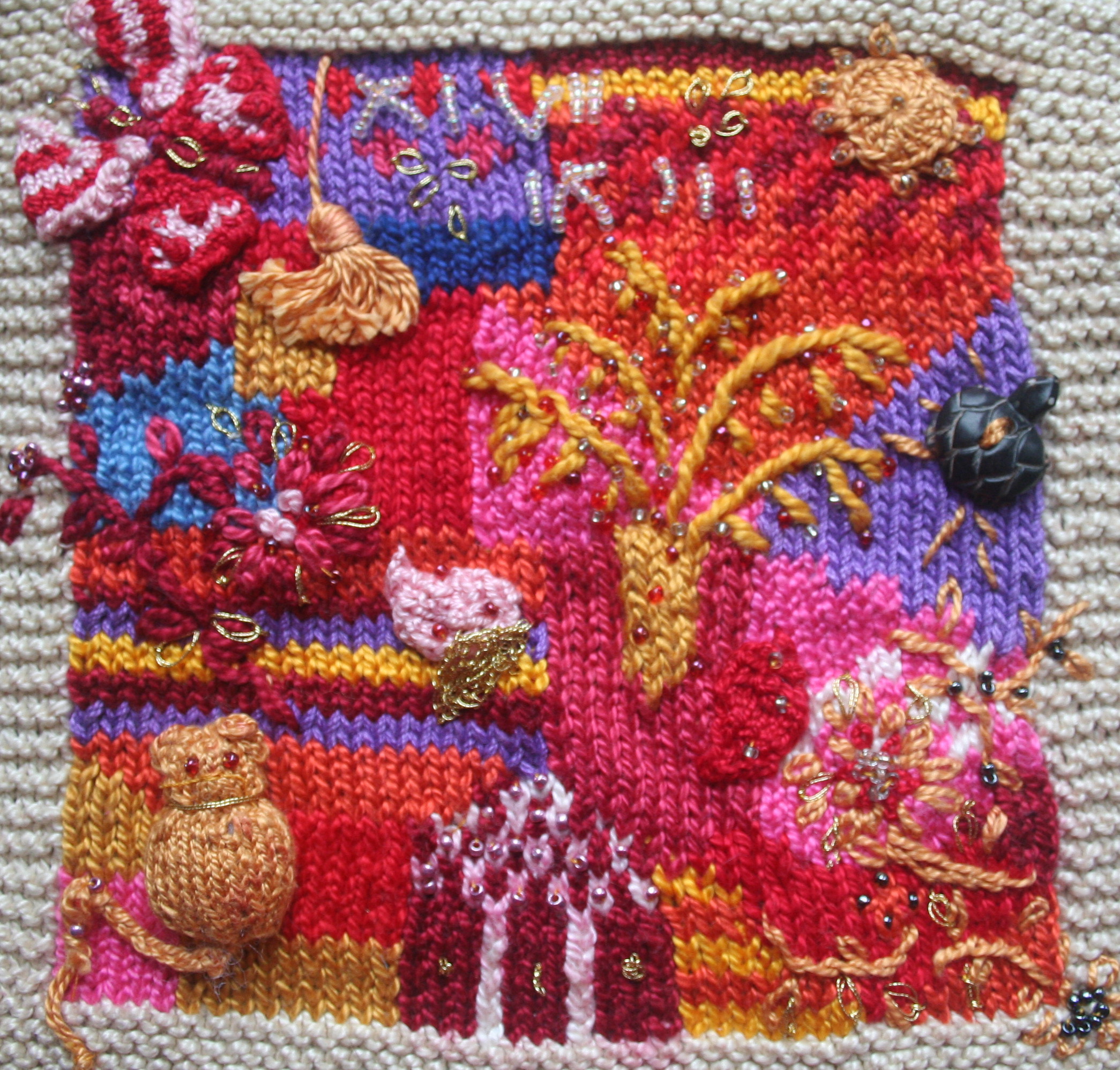 This is actually a small square about 5″ x 5″ which I knit in DMC about 20 years ago as part of another opportunity to submit a knitted piece for a museum show (non-juried). I love crazy quilts because they are free form and allow for a some rich embellishment. First, I knit the basic fabric creating random shapes, using fair isle and intarsia. Some of the shapes I beaded. Finally, I added embellishments which I appliqued on. I had to include a date on the piece and I was looking for gold beads which I knew I had. Anyway I couldn’t find them in time so I used some smaller white beads – not as effective. I have subsequently found (and lost) these gold beads many times over these last 20 years.
